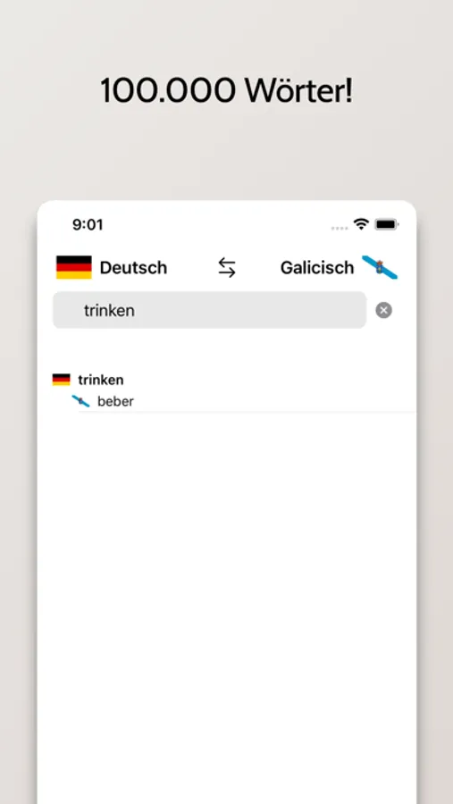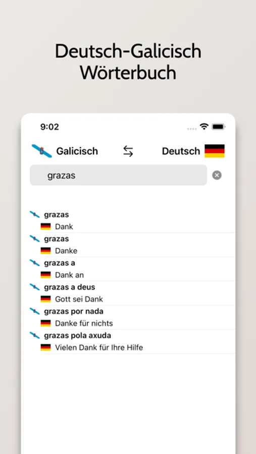 - Möglichkeit, um nach Wörtern sowohl auf Deutsch als auch auf Galicisch suchen.