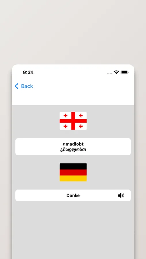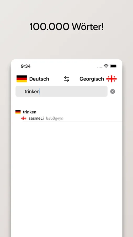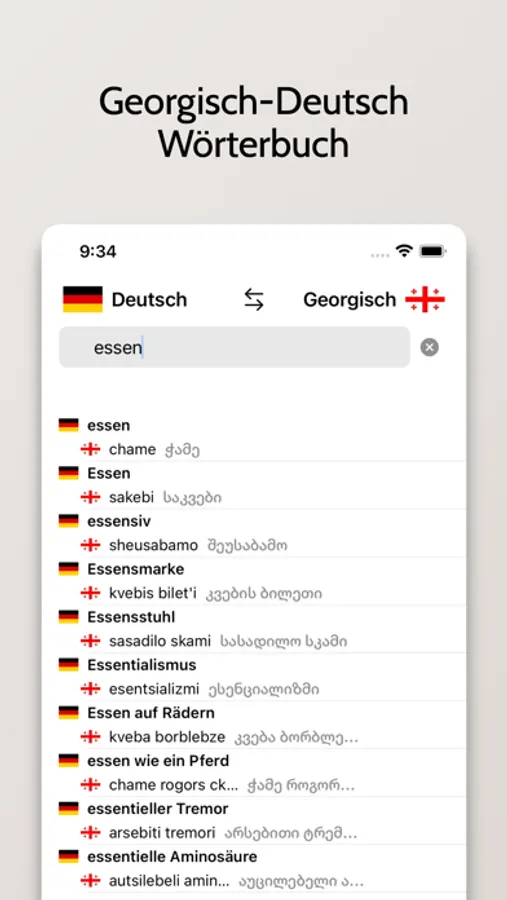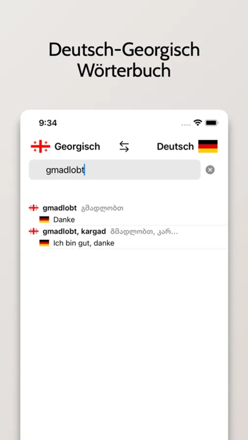 - Möglichkeit, um nach Wörtern sowohl auf Deutsch als auch auf Georgisch suchen.