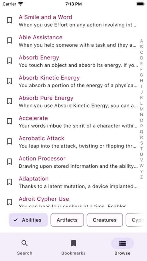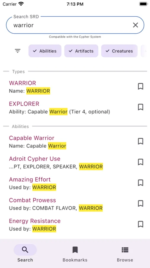- Look up all SRD Abilities, Types, Foci, Descriptors, Cyphers, Creatures, and more