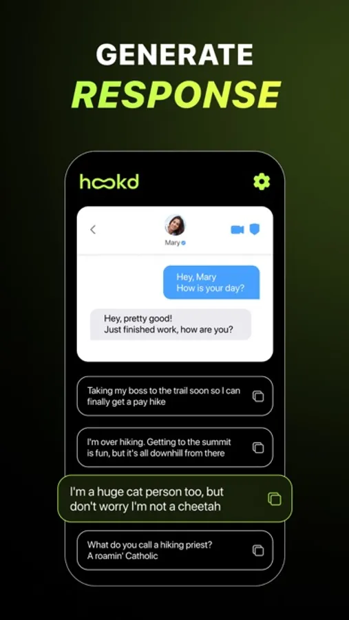 - Extensive Library of Prompts and Pick-Up Lines: Explore a vast collection of prompts and pick-up lines suitable for various situations. Whether you're lost for words or want to add a little spark to your conversation, Hookd AI has got you covered!
