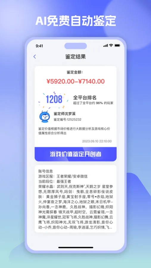 系统通过AI算法进行市场分析与价格分析,并有专业鉴定师辅助,玩家只需根据自己的账号信息填写资料,系统会根据玩家的账号内容进行判定,极速精准评估账号价格。