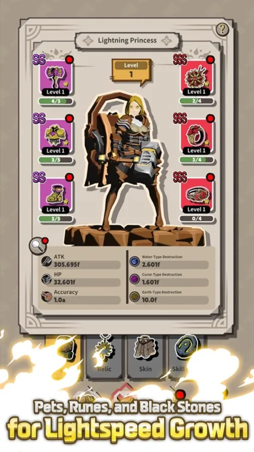 - 6 Types of Dungeons: Collect various resources you need for your Lightning Princess' growth!