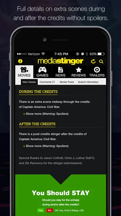 "'Oh man! Did you see that extra scene after the credits? It was great!' Ever heard those words in the lobby after you'd walked out before the credits finished rolling? MediaStinger helps avoid that sort of disappointment." -Lifehacker.com
