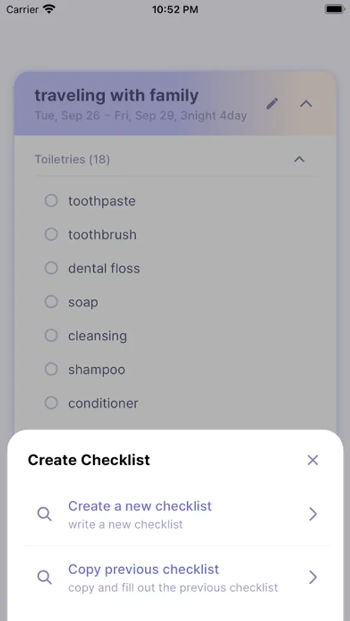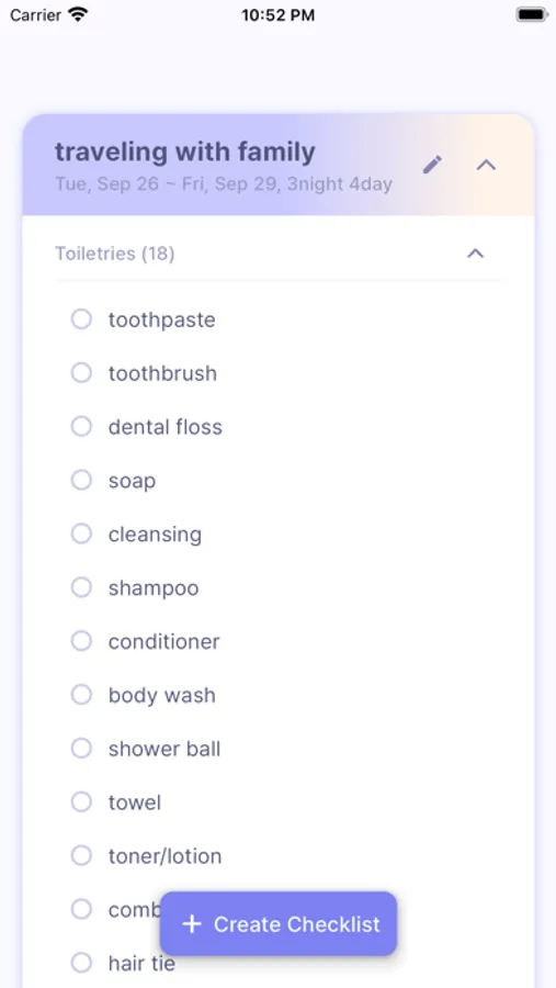 Checklist creation: Create customized checklists based on your trip purpose, duration, and destination.