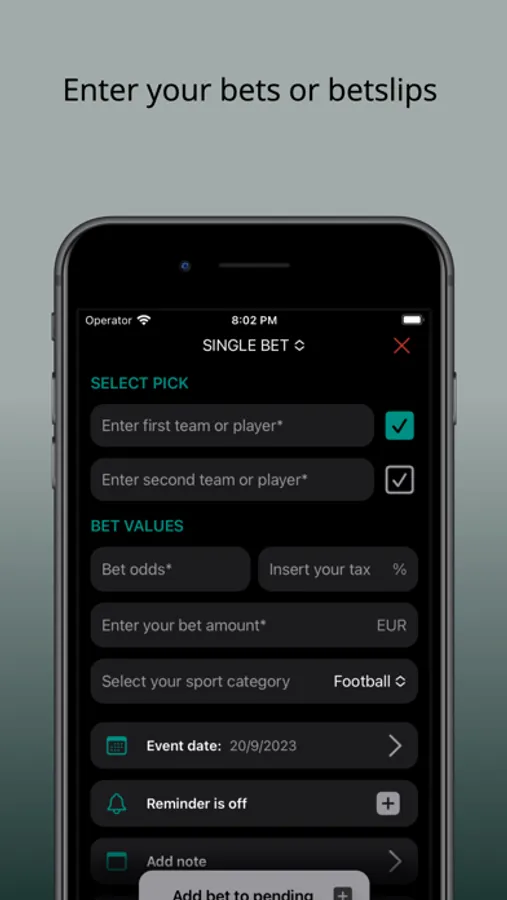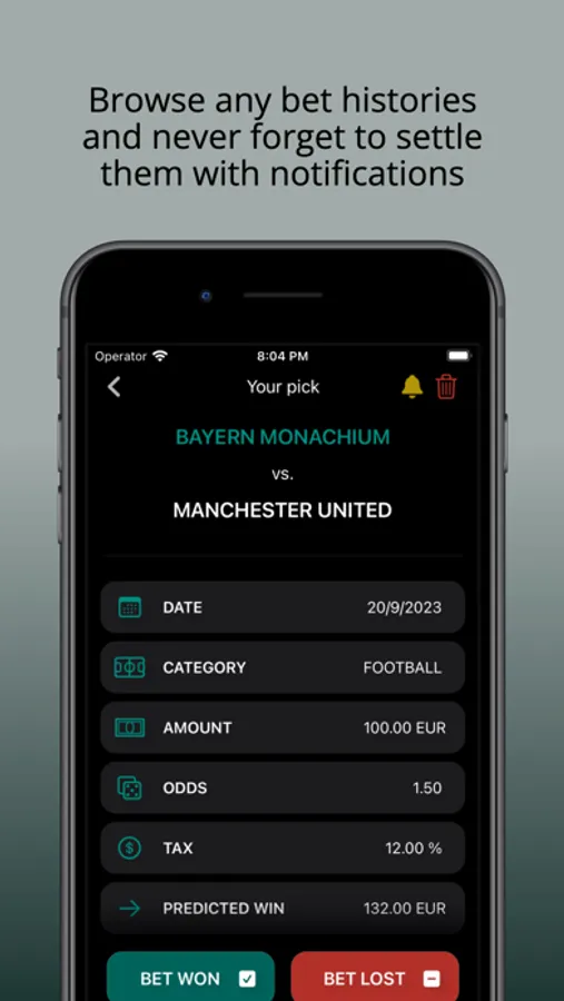 Quickly and easily input your bets, from single wagers to betlips. Personalize your tracking with custom tax rates and other values to get a real-time view of your potential returns. Set timely notifications ensuring you never miss settling a bet and stay on top of every wager, win or lose. With a single tap, export all your betting data into a spreadsheet, ideal for analysis, backup, or sharing.