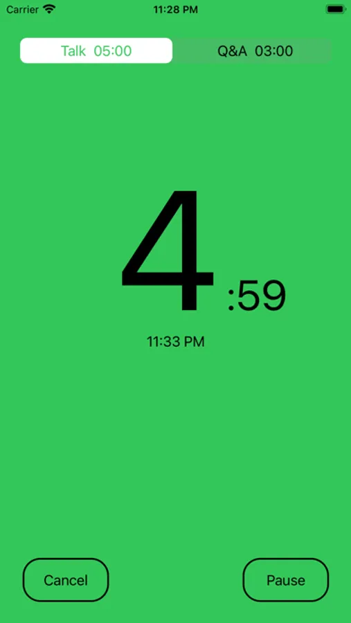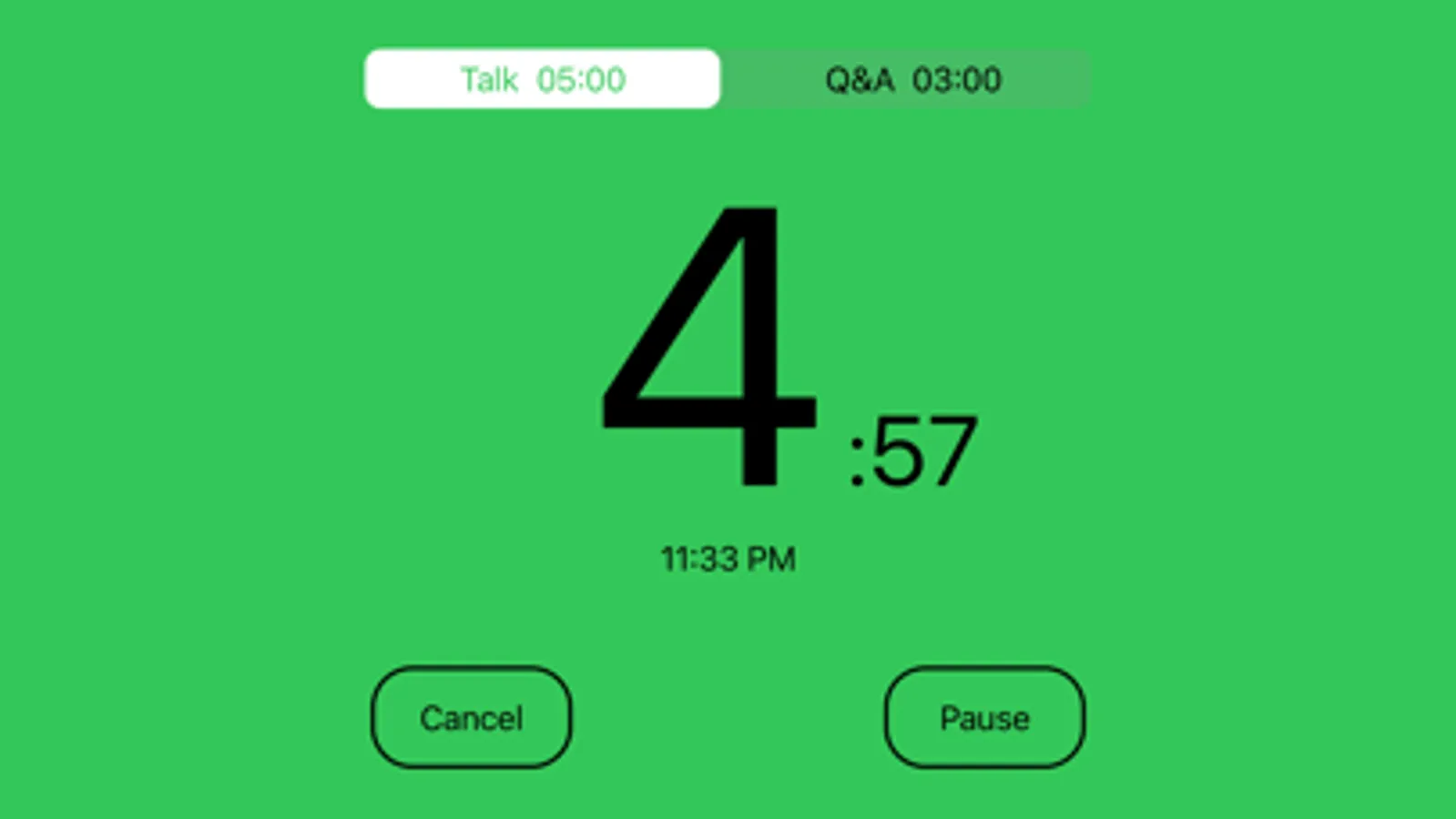 * The app's background gracefully transitions from green to yellow to red as time passes, offering speakers an intuitive, non-intrusive visual cue. Green signifies ample time, yellow suggests they’re halfway through, and red warns that their time is nearly up.