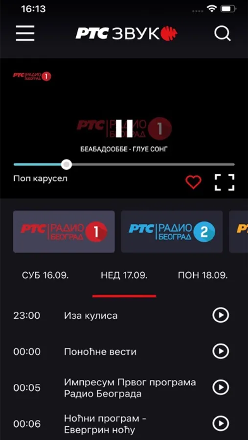 It contains streaming of all Radio Belgrade programs: Radio Belgrade 1, Radio Belgrade 2, Radio Belgrade 3, Radio Belgrade 202, RTS Pletenica, RTS Rokenroler, RTS Džuboks and RTS Vrteška.
