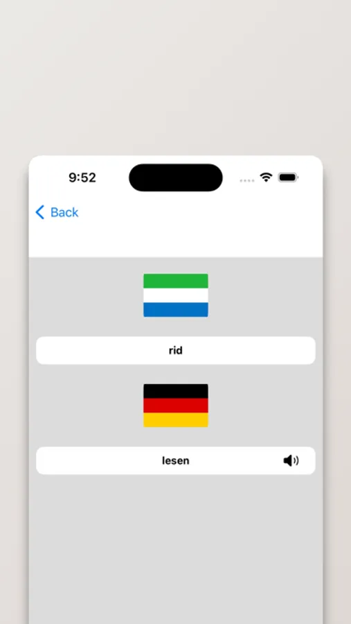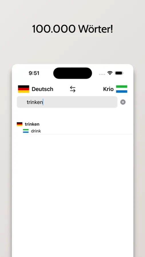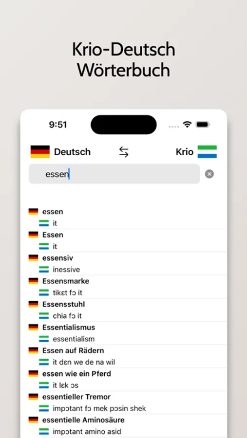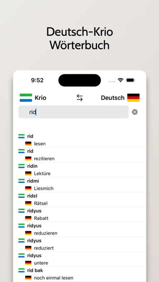 - Möglichkeit, um nach Wörtern sowohl auf Deutsch als auch auf Krio suchen.