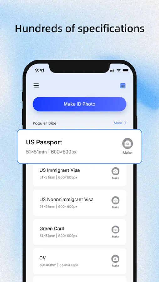 Using the id photo phd app, you can easily make us passport photo, 2x2 photo,ID card, resume, driving license photo, visa photo and other id photos at any time and anywhere!