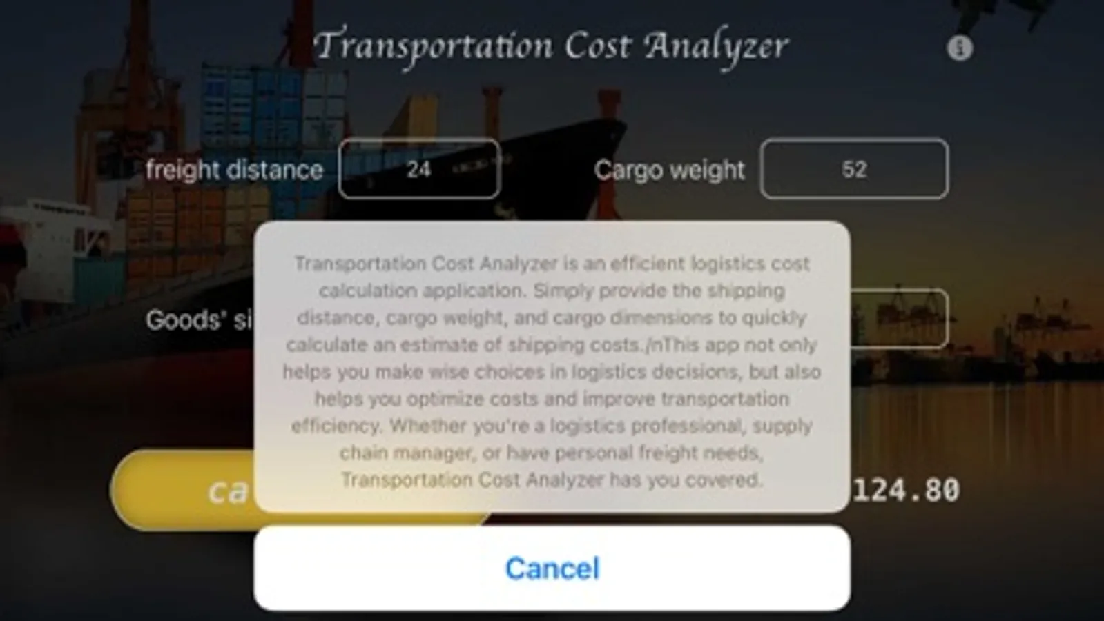 Transportation Cost Analyzer is an efficient logistics cost calculation application. Simply provide the shipping distance, cargo weight, and cargo dimensions to quickly calculate an estimate of shipping costs.