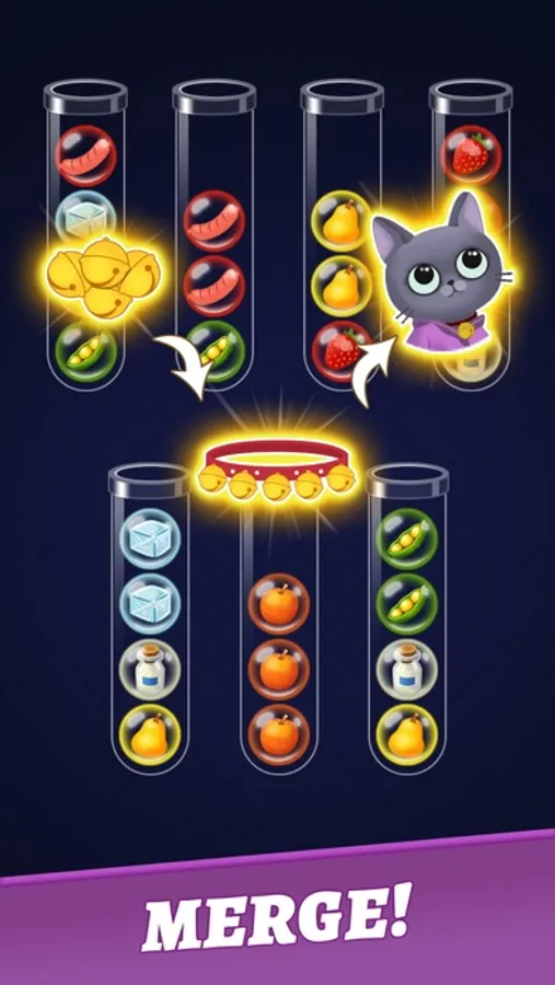 Ball Sort - Merge Pet Mania is a brand new puzzle game for FREE! Simply tap a tube to sort balls by color and merge ingredients into tasty food. Keep lovely pets with food/toys, and enjoy pet mania.