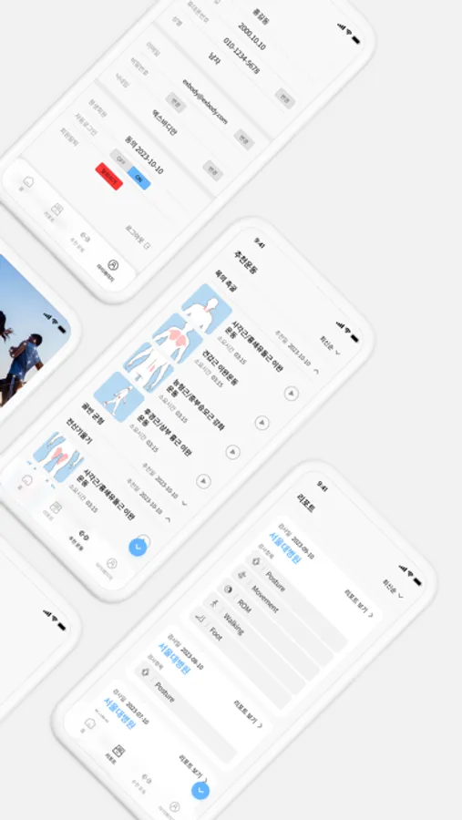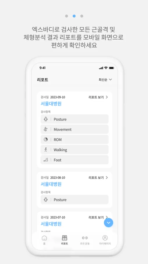 엑스바디로 검사한 모든 근골격 및 체형분석 결과와 리포트 히스토리를