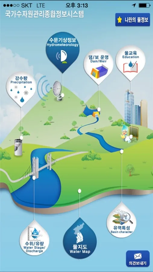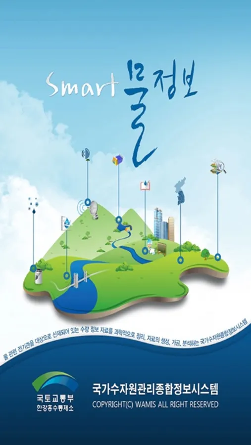 국가수자원관리종합정보시스템(http://www.wamis.go.kr)에서 제공되고 있는 수위/유량, 강수량, 수문기상정보, 물지도, 댐수문, 유역특성, 물교육정보 등을 언제, 어디서나 간편하게 접근하여 이용할 수 있도록 정보를 제공하고 있습니다.