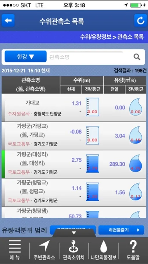 - 수위관측소별 유량백분위를 표시한 물지도 제공