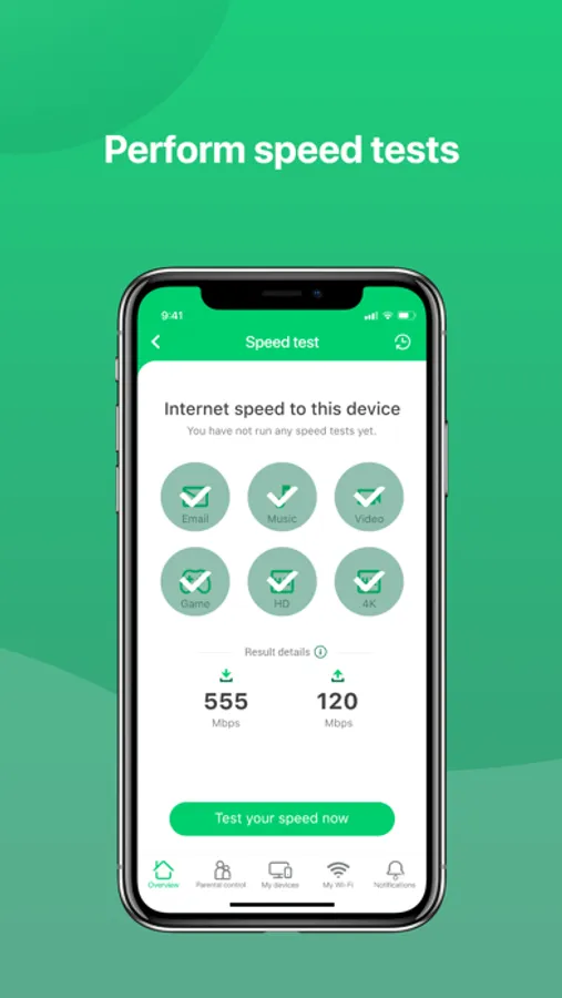 • Perform speed tests to validate the speed of your broadband connection, as well as the one to your device to determine for example the cause of a slowdown.