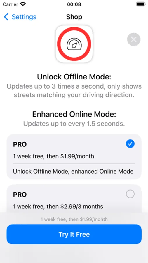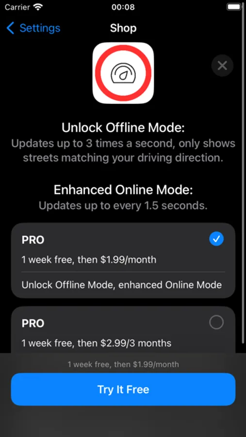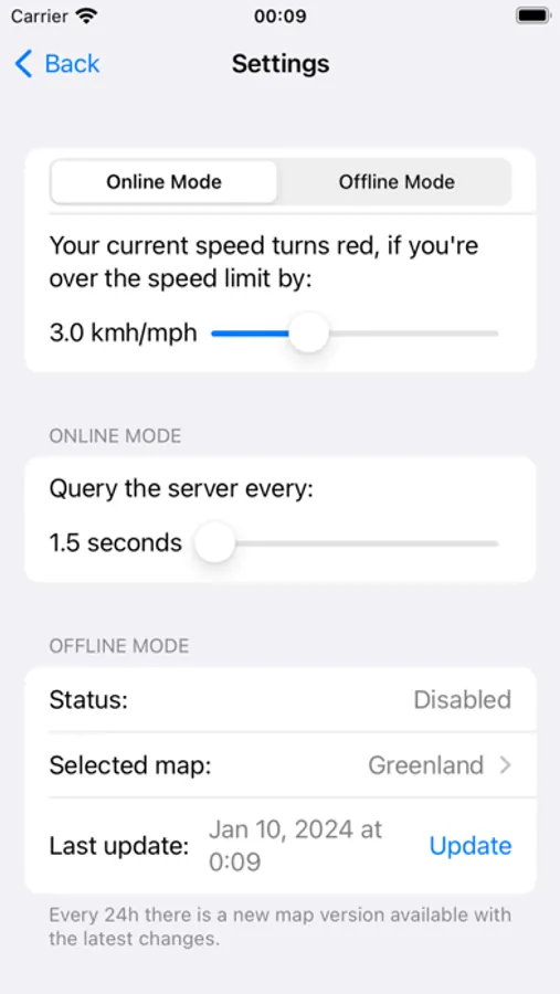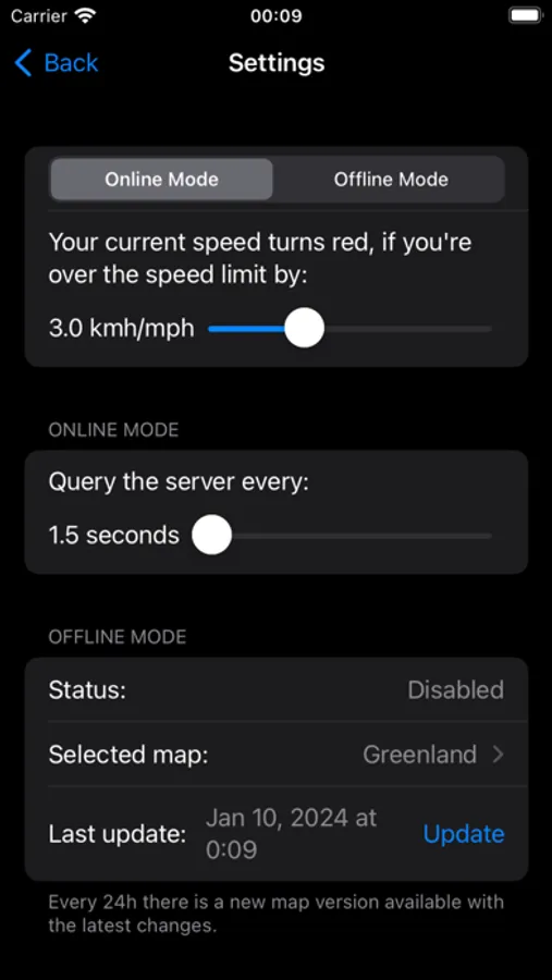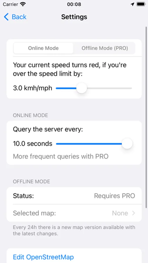 The paid version unlocks the recommended offline mode and enhances the online mode. In offline mode, the app updates up to 3 times a second and only shows streets with the same direction as the driving direction. In online mode, the app updates up to every 1.5 seconds.