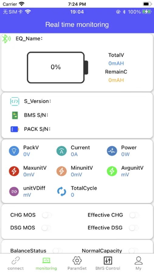 打开app连接我们BMS配套电池查看电池状态各项数据信息,如电压,电流,温度,容量等