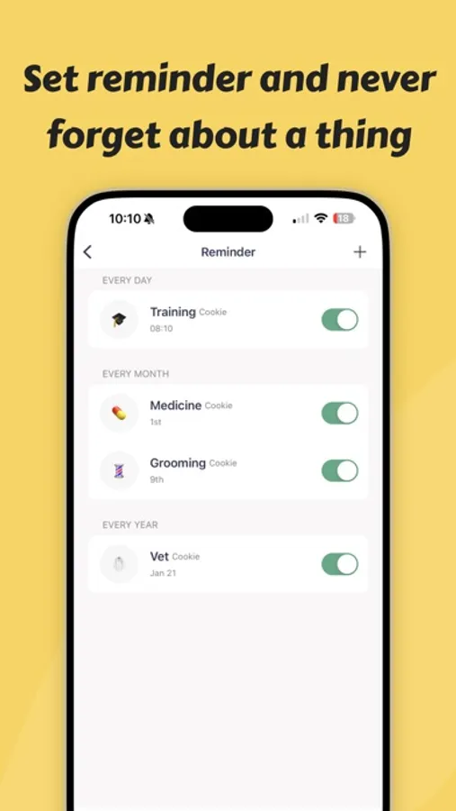 - Reminder: Create repeatable reminders for medications, vaccinations, grooming sessions, and more.