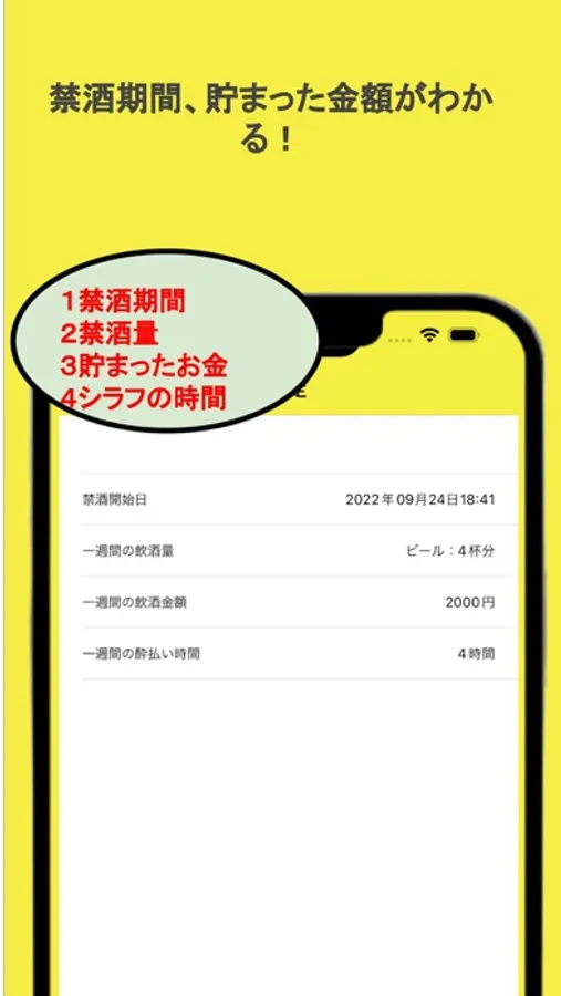 禁酒を始めてからの経過時間を秒単位で表示。節酒した量・節約額・シラフでいれた時間も自動計算。
