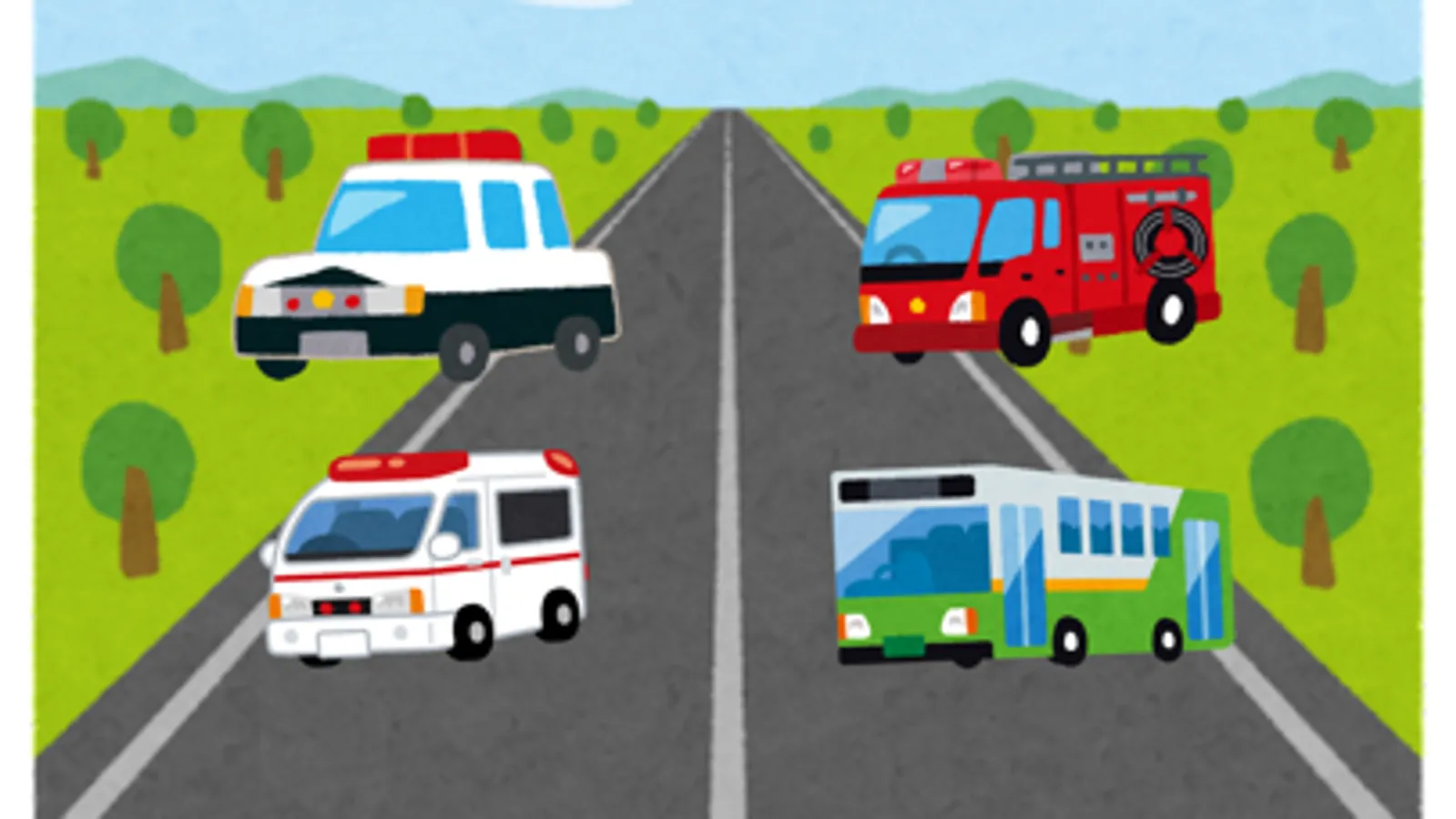 新幹線、機関車、パトカー、救急車、消防車、バス