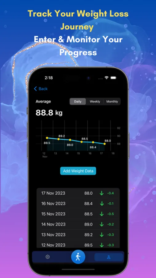 Weight Loss Tracking: Enter your weight regularly to monitor your weight loss progress and celebrate your achievements.