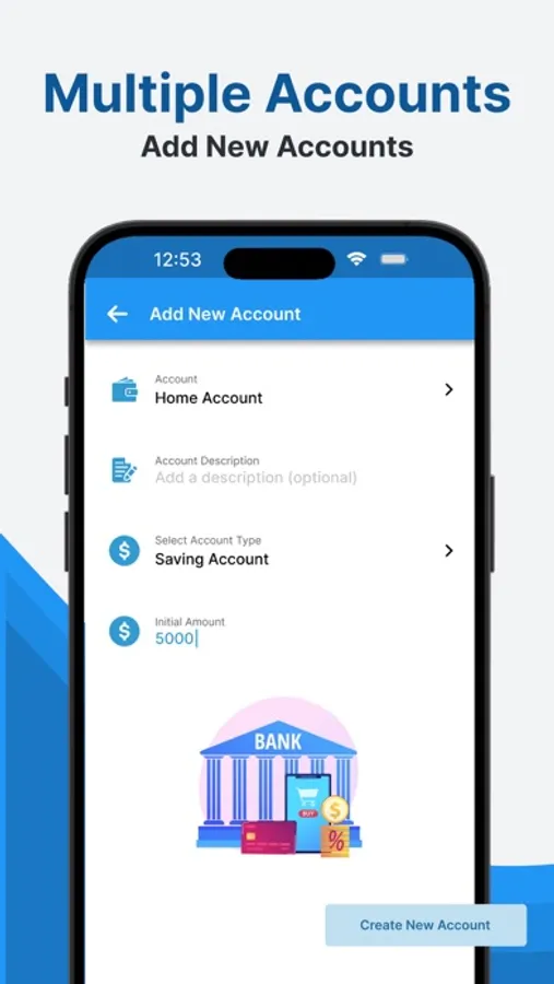 In the Budget Tracker App, you can create multiple accounts. For example, if you want to track the budget record for your home and office separately, you can create two different accounts—one for your home and a second for your office budget tracking. All the records of those accounts will remain separate, and you can manage them easily.