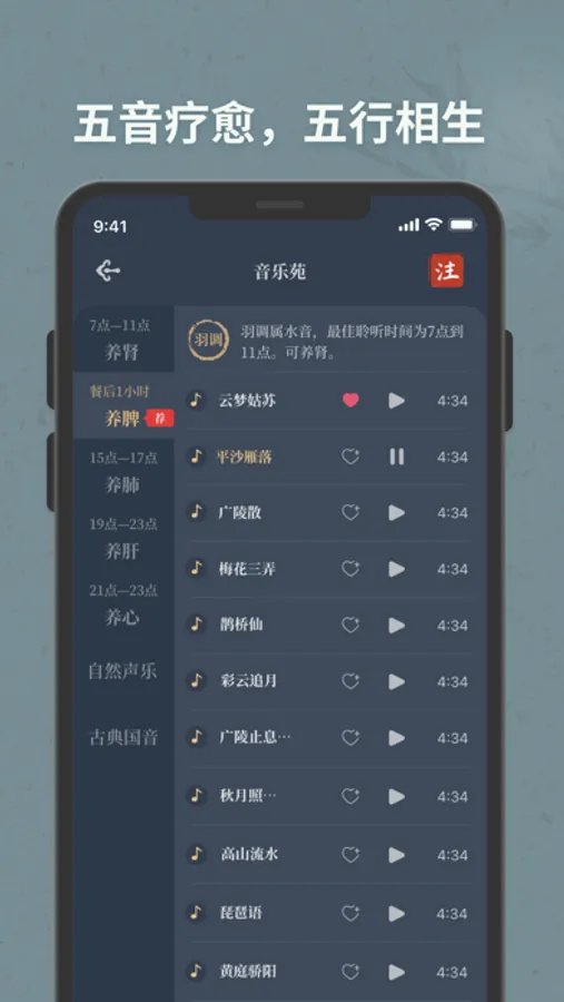 基于中医“五音疗疾”理论,“宫为土音通于脾,商为金音通于肺,角为木音通于肝,徽为火音通于心,羽为水音通于肾”,提供丰富的五音乐库,以及精选的大自然声音,帮助您营造舒适放松的睡眠氛围。