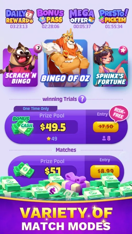 Explore a variety of skill-based bingo games for bigger cash wins. Each mode has its own strategies and exciting gameplay. There's a Bingo for everyone.