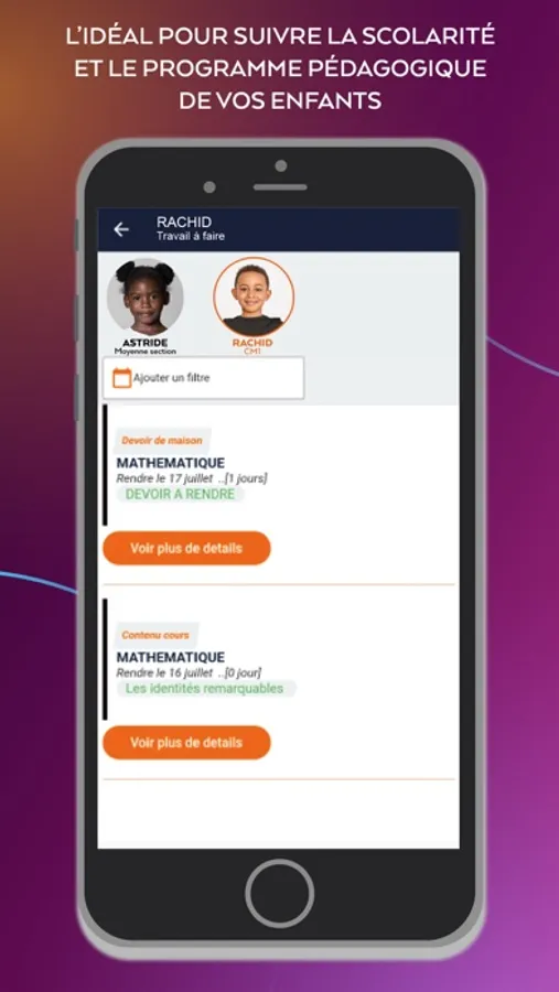 * Accès au cahier de textes et aux devoirs de maison des enfants