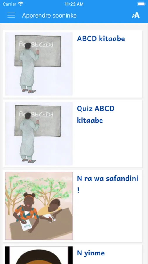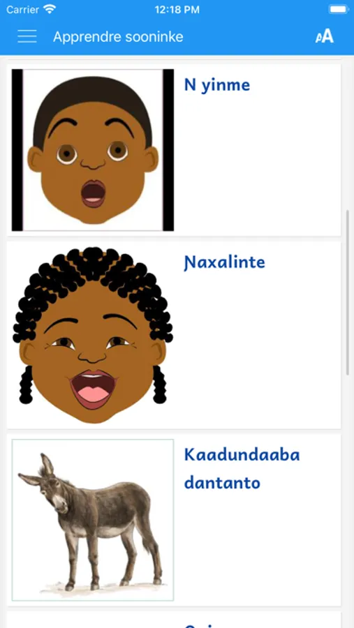 « Apprendre le sooninke » est une application qui aide votre enfant à apprendre à lire et à écrire en langue soninké. À travers cette appli, votre enfant va apprendre l’alphabet, les noms des différentes parties de la tête, les noms des animaux domestiques et des légumes. Votre enfant va aussi apprendre les expressions de joie, de tristesse, et beaucoup d’autres belles choses. Huit livres de lecture pour plaisir en version illustrés, à écouter en version audio et à traduire dans d’autres langues. Ce sont des livres avec des mots et phrases courts, simples et facile à lire. Des livres image-mot et image-phrase. Ils sont faits pour les enfants âgés de 4 à 8 ans. Une appli avec des quiz pour tester le niveau de connaissance de votre enfant. Profitez donc de cette application éducative pour passer un excellent moment avec votre enfant. Les livres ont été créés par SIL Mali pour le projet LiNEMA (Livres numériques pour nos enfants au Mali), un projet de Lecture Pour Tous.