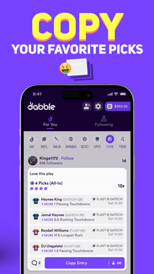 Not sure whether to go More or Less? Say less. With Dabble’s Copy Entry feature, you can instantly copy entries from your favourite Dabblers - including DFS experts and sports stars - straight to your profile. It’s that simple. Find an entry you like, hit copy, and ride their picks to victory.
