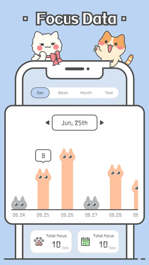 "Focus Cat" offers a range of powerful features that allow you to better manage your time, enhance your focus, and provides comprehensive data analysis so you can understand your study and work habits. It has a flexible focus timer, allowing you to freely choose the duration of your focus. Using the Pomodoro Technique, you focus for a period of time, take a few minutes break, and then claim corresponding rewards to feed your kitten. This cycle makes learning fun, while you and your kitten grow together!
