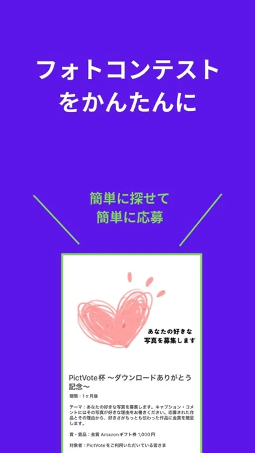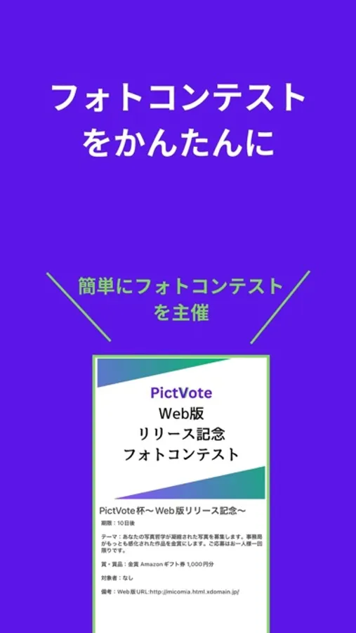 PictVoteでは従来はWebの知識が必要であったり、代理店に依頼しなければいけなかったフォトコンテストを記入事項を埋めるだけで簡単に作成できるアプリです。また、フォトコンテストを作成しない方でも、アプリの中ではPictVoteだけのフォトコンテストが掲載されていたり、PictVote以外のフォトコンテストも掲載されていますのでこのアプリを使えば開催中のフォトコンテストを探す必要はありません。