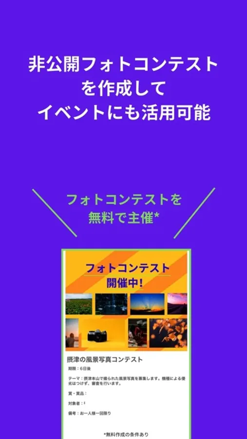 フォトコンテスト無料作成の条件は「賞品なし、応募枚数32枚」です。お支払い金額が50円以下の場合は無料作成をご利用いただけます。PictVote内で表示されいるフォトコンテストにApple, Incは一切関係しておりません。