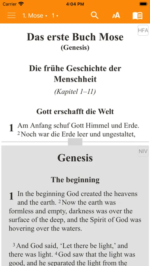 Biblica New International Version in Englisch, die Seite für Seite oder Vers für Vers mit der deutschen Übersetzung gelesen werden kann.