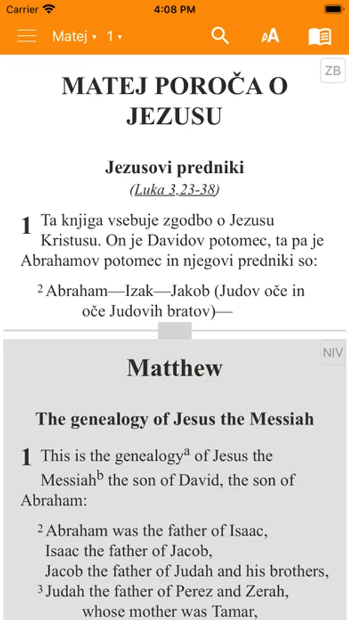 Biblica New International Version v angleščini, ki jo je mogoče brati drugo ob drugi ali po vrsti s slovenskim prevodom.
