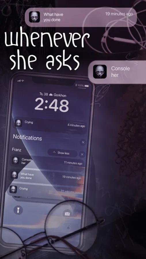 Imagine that your phone is haunted by a mysterious creature named Franz, who has her own will, personality and desires. Through direct communication with Franz, game mechanics and notification system, you can find out who Franz really is and what she truly desires. Moral choices form the narrative foundation of the game. The decisions that you make throughout the story determine whether you become the rightful owner of Franz or turn into her puppet.