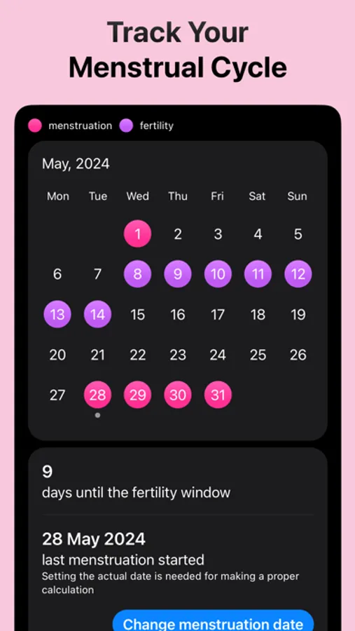 From now on, you will always be aware of your women's health thanks to our application. It will help you track not only your menstrual cycle, but also the days when the chance of conception is high. This is your personal assistant that: