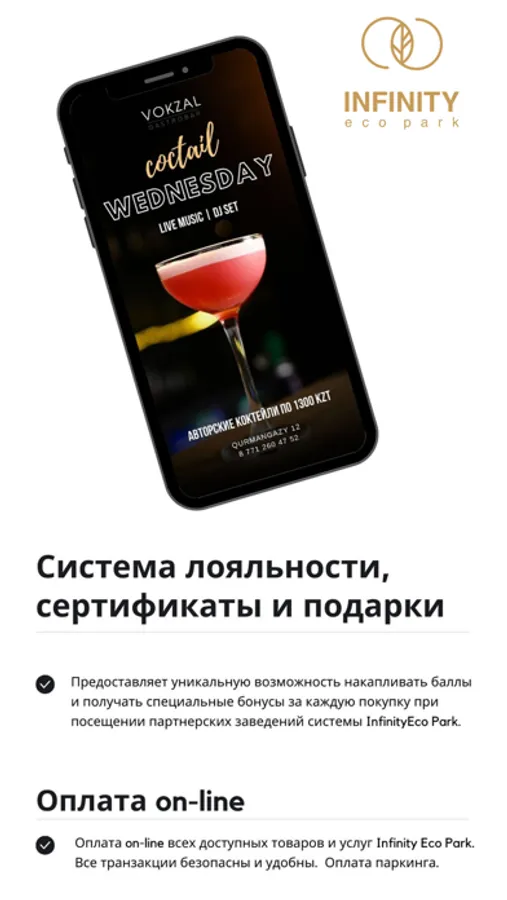INFINITY SMART - многофункциональное приложение INFINITY ECO PARK, которое позволит вам накапливать и пользоваться бонусами и подарками от партнеров сети.