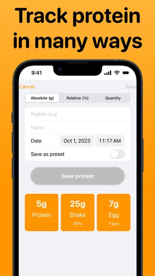 Easily log your daily protein intake with absolute or relative amounts. Whether it's a chicken breast, a scoop of protein powder, or a homemade protein shake, we've got you covered.