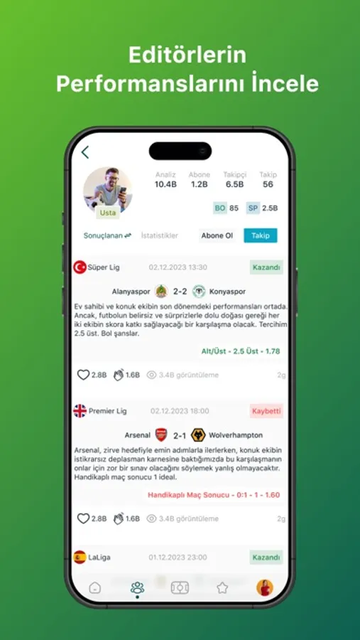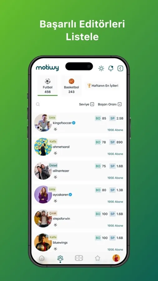 Motiwy'de editörler tarafından yayınlanan analizleri inceleyebilir ve istatistiksel veriler ile en iyi editörleri takip edebilirsin.