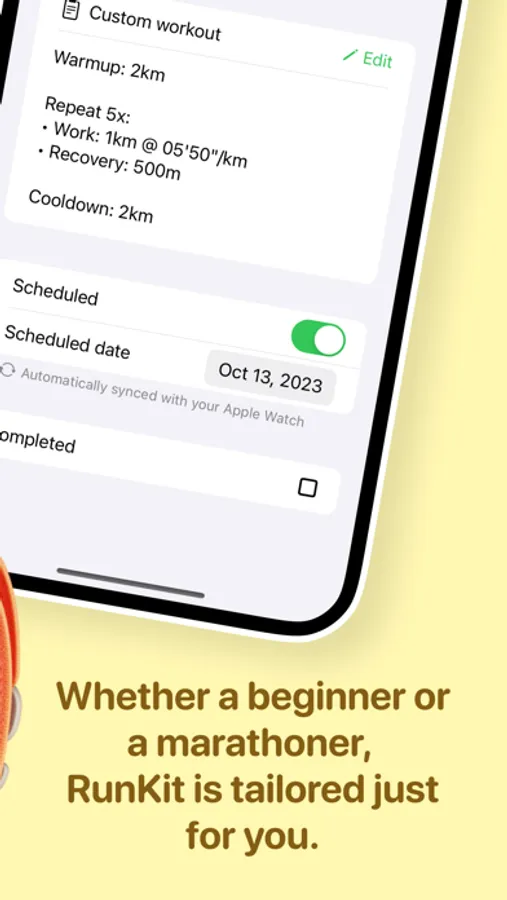 Apple lets you create workouts on iPhone. RunKit goes further: it gives you a real workout scheduler + planner that works with Apple Watch and every sport (running, cycling, swimming, strength, triathlon and more).
