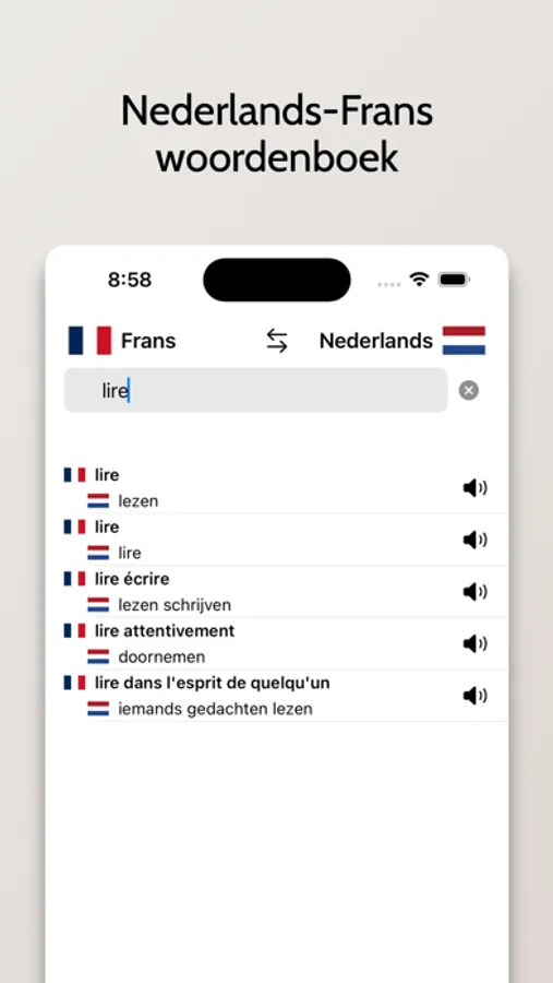 - Mogelijkheid om woorden zowel in het Nederlands als in het Frans op te zoeken.