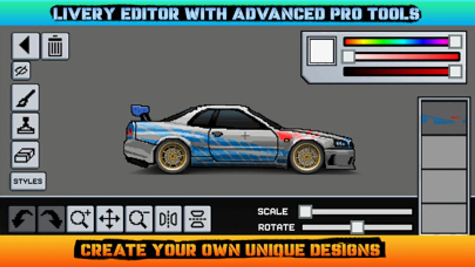 Design your ride with spoilers, bumpers, wraps, colors, and unique styles.
