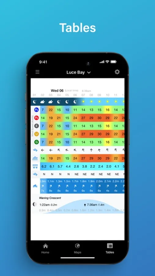- Detailed Data Tables: Access hourly data on current speed and direction, plus alerts for wind-against-current situations.