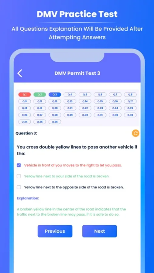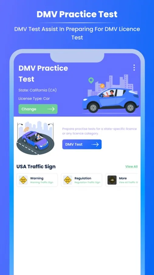 Prepare for the DMV exam with our large library of practise questions covering all aspects of traffic rules and regulations. Whether you're a new or experienced driver looking to brush up on your skills, our app has you covered.