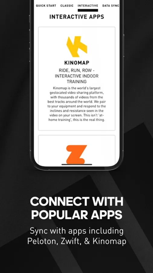 Take your training to new heights with an intuitive app that injects new life into your sessions. Connect with popular training apps like Peloton, Zwift and Kinomap to bring excitement and diversity to each workout, allowing you to join interactive classes and experience more immersive training environments.
