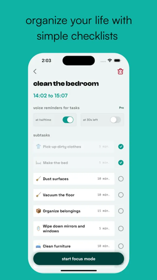 To help you actually do your to-do's, neurolist has a smart timer, which lets you complete each task like a playlist, with a timer for each subtask. Then it dynamically estimates how long it will take to complete, while notifying you via voice notifications along the way. Perfect to avoid ADHD procrastination.