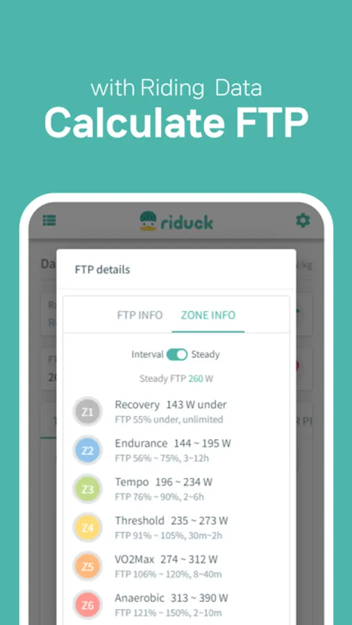 Just focus on riding. Riduck will inform you of FTP and peak power renewal.
