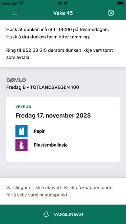 - Tømmekalender med varsel om kva dunk som skal setjast ut.